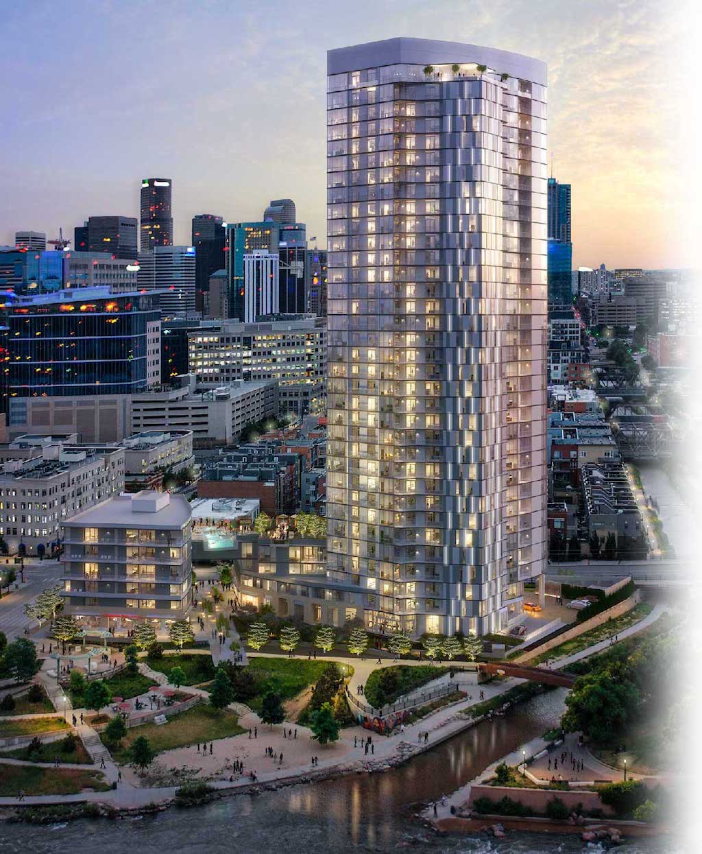 Now the Confluence occupies the space at 2166 15th Street, extending 34 stories up with 288 apartments, specifically for luxury renters. The three-building layout ports a bluish reflective glass that casts itself apart at the confluence of Cherry Creek and the South Platte River into a mix of curves, glass, metal and masonry rising above the landscape and surrounding waterways.